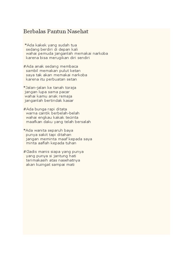 Nah, berikut ini contoh pantun nasehat untuk anak sekolah agar lebih semangat lagi menuntut ilmu atau belajar. Dengan pantun orang dapat menyampaikan nasehat, pesan moral. Pantun kesehatan untuk anak sd smp dan sma operator sekolah. Seperti di bahasa jawa kuno ada kata 'atuntun' yang berarti aturan; Namun, disini tamilchill akan terfokus pada.