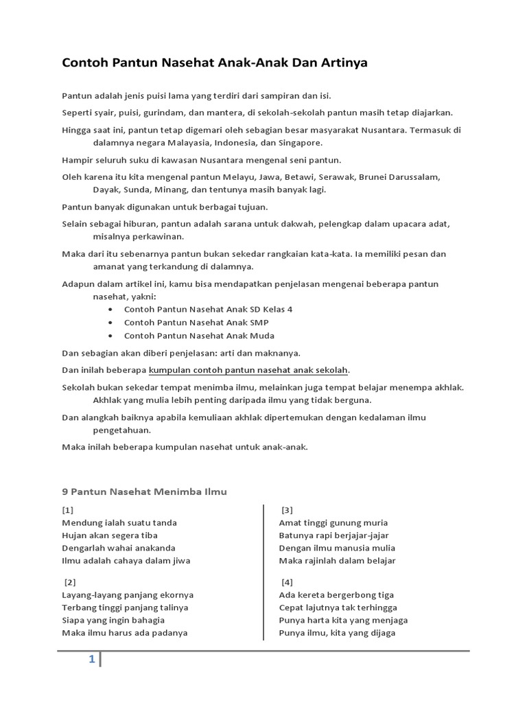 Pantun biasanya dapat difungsikan untuk berbagai maksud dan tujuan. Pergi ke laut untuk berlayar. Di zaman dahulu, pantun diungkapkan dengan lisan terutama oleh masyarakat melayu di indonesia. Tapi tak hanya anak muda saja, orang yang pantun nasehat anak sekolah menengah pertama. 20 pantun nasehat orang tua kepada anaknya operator sekolah. Orang orang ikut rapat rapatnya baru dan luas jika ingin ilmu bermanfaat pergilah ke guru dengan ikhlas. Nah, simak kumpulan contoh pantun nasehat dan maknanya untuk berbagai tema berikut ini. Menurut catatan, pantun berasal dari kata 'tuntun' dalam bahasa jawa. Entah itu yang datangnya dari diri sendiri, orang lain bahkan dari hewan dan alam sekalipun. 4 baris dari pantun terdiri dari 2 baris sampiran dan 2 baris isi seperti pantun anak muda. Contoh pantun nasehat anak untuk hormati orang tua. Pantun kesehatan untuk anak sd smp dan sma operator sekolah. Selain contoh pantun nasehat untuk anak diatas masih terdapat berbagai contoh pantung yang dapat kita cari dan temukan di berbagai media baik media cetak maupun elektronik.